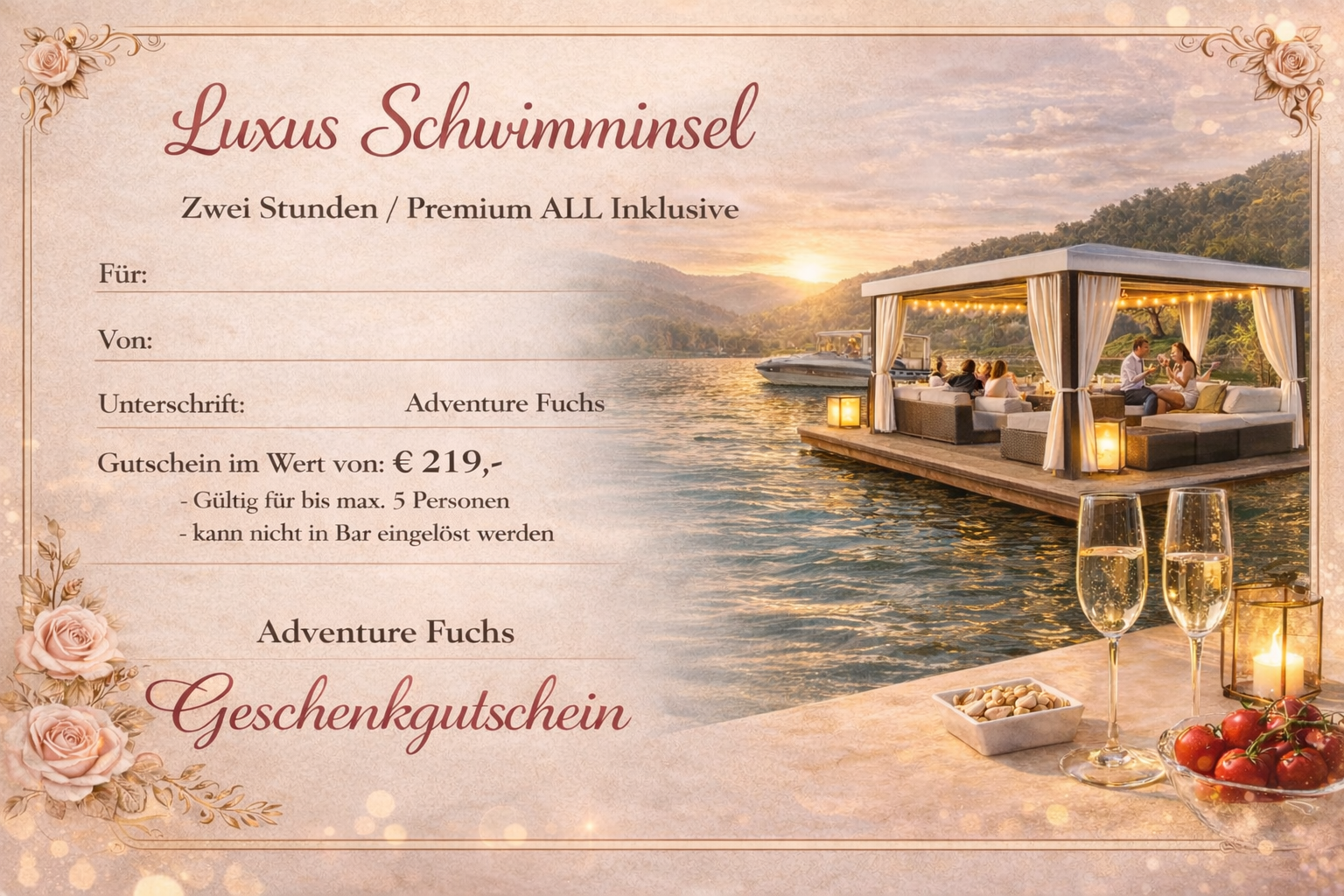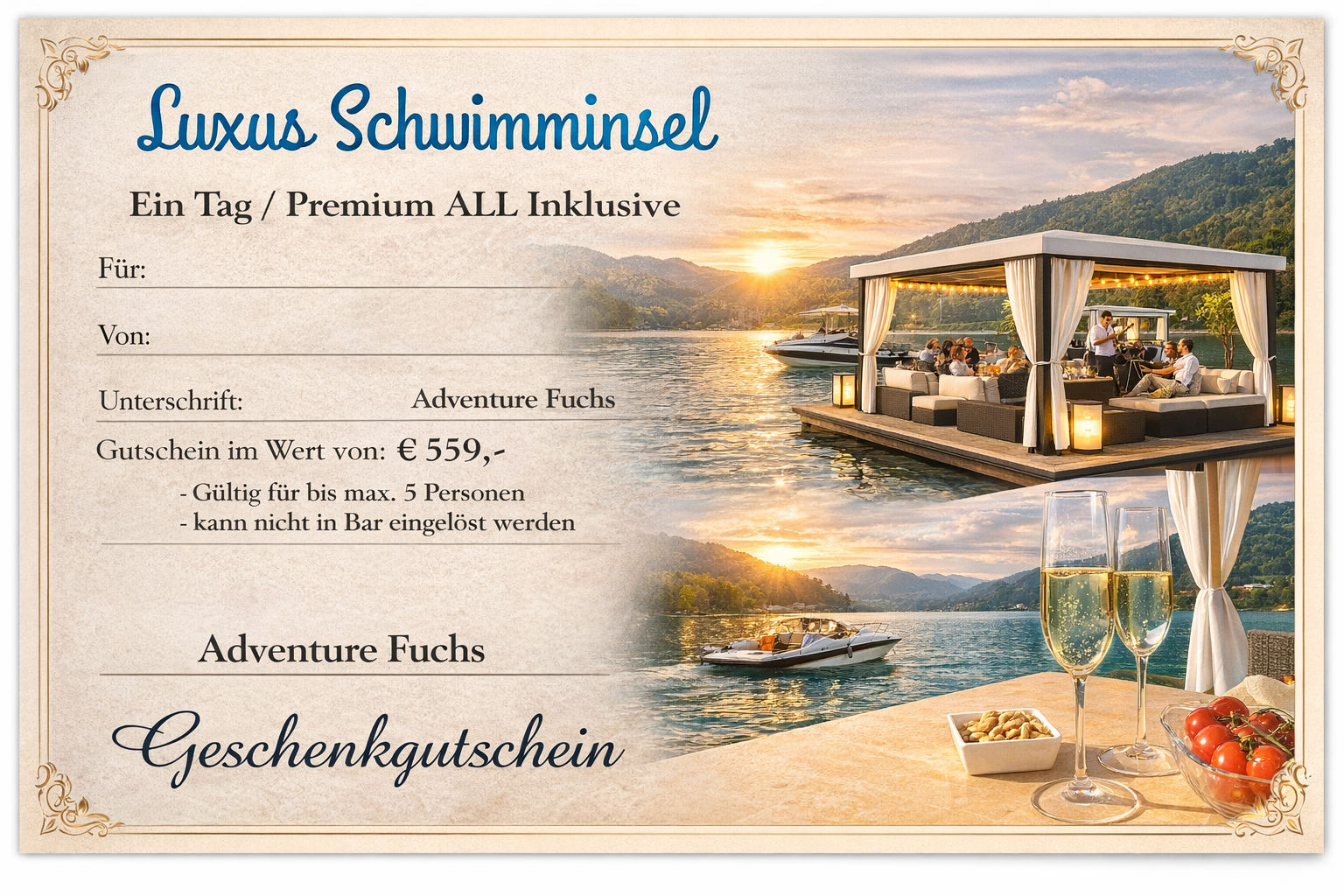 Dieser Gutschein bietet Platz für bis zu fünf Personen und verwandelt einen ganzen Tag in ein privates Insel-Paradies – ideal für besondere Anlässe, intime Feiern, romantische Erlebnisse oder einfach eine Auszeit vom Alltag.