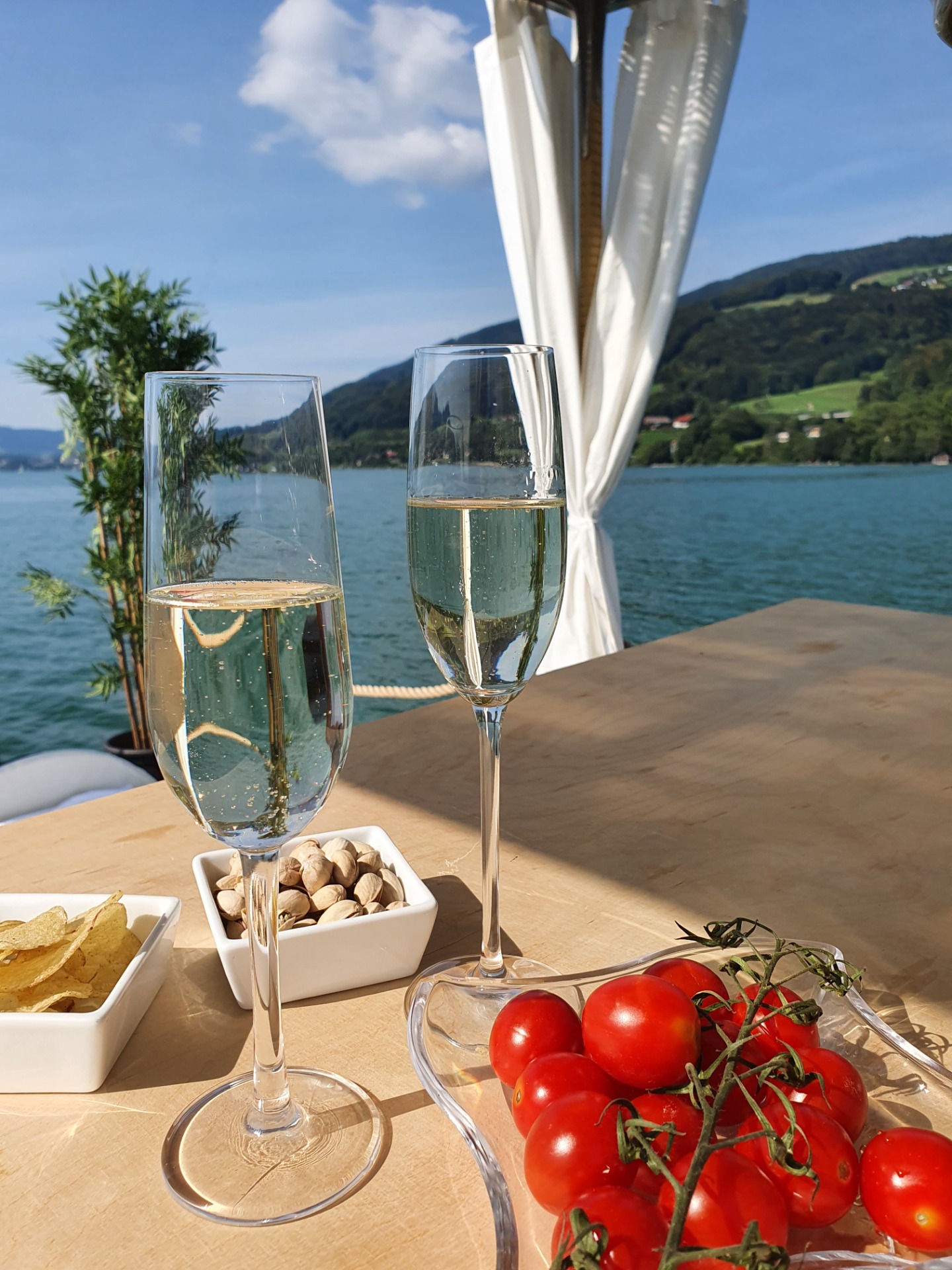 Sie bekommen bei jedem Schwimm-Insel Verleih pro Person 1x Mineralwasser, 1x Prosecco (0,2l) und Snacks kostenlos dazu